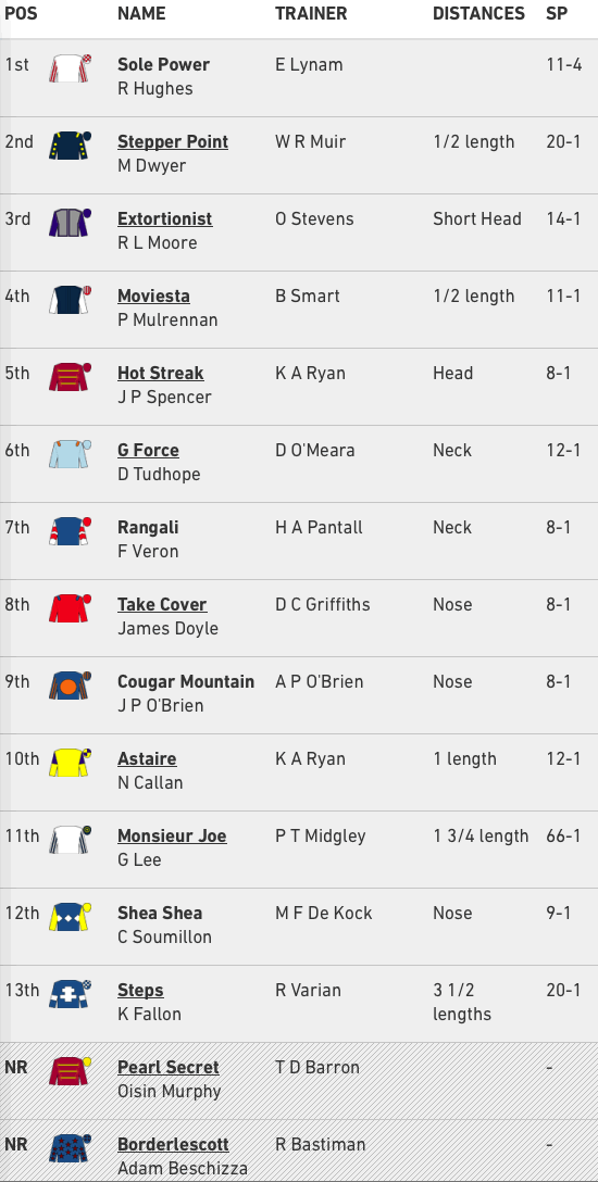 Hughes had to make a dramatic move to switch Sole Power as he had nowhere to go with just over a furlong left, but they dived through a gap to pinch the race from Stepper Point, eventually scoring by a half-length margin. Extortionist was third, another short head back.
